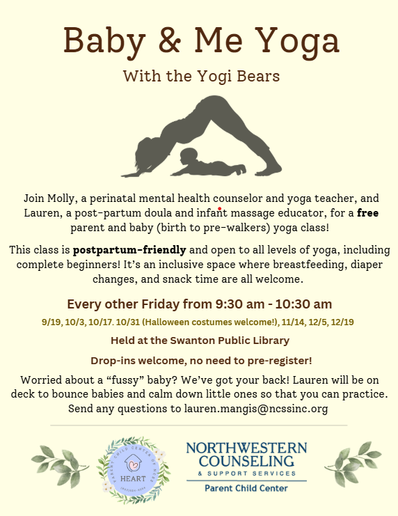 Join Molly, a perinatal mental health counselor and yoga teacher, and Lauren, a post-partum doula and infant massage educator, for a free parent and baby (birth to pre-walkers) yoga class! This class is postpartum-friendly and open to all levels of yoga, including complete beginners! It’s an inclusive space where breastfeeding, diaper changes, and snack time are all welcome. Every other Friday from 9:30am – 10:30am Held at the Swanton Library Drop-ins welcome, no need to pre-register! Worried about a “fussy” baby? We’ve got your back! Lauren will be on deck to bounce babies and calm down little ones so that you can practice. Send any questions to lauren.mangis@ncssinc.org